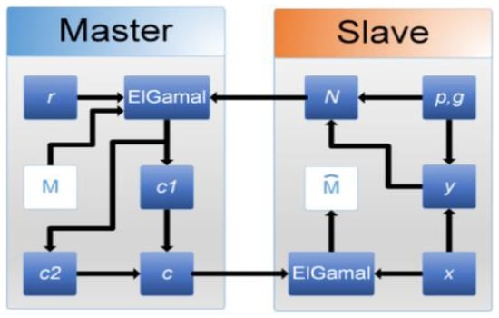 As shown in Figure 5, the traditional El-Gamal algorithm needs to generate the prime number , the primitive roots , and the private key , and the public key , by the slave system and then form the public key , and transmit to the master system. However, the ciphertext can be obtained by computing the plaintext , the public key , and the random positive integer at the master system. Then, the ciphertext will be sent to the slave system by the master system and use private key and the public key , and finally, we obtain the recovered plaintext through the decryption computation. In addition, it can be seen that the encryption signal of the El-Gamal algorithm includes a random positive integer , so that it has a random characteristic. That is, the same plaintext can be encrypted to generate many kinds of cipher text.