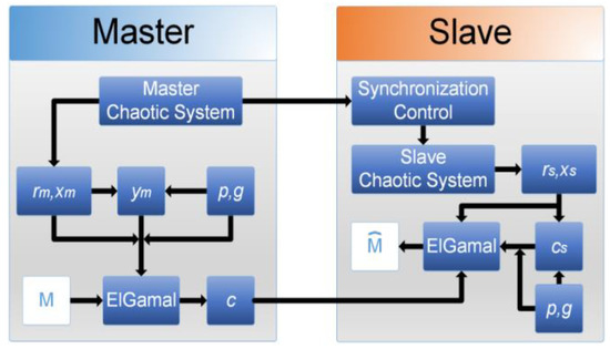 With the rapid progress being made in science and internet technologies, the security requirement for information confidentiality is continually increasing. Against this backdrop, many theories, including chaos theory [1], have been used to address such information security issues. Chaos properties, such as broadband noise-like waveform, which depend sensitively on the system’s precise initial conditions (Butterfly effect) have been generally studied and these properties offer some advantages for solving and enhancing information security issues [2,3,4,5]. Another method is symmetric key encryption and public key encryption in modern cryptography. The common algorithms include RSA [6], El-Gamal [7], and ECC [8] among others [9,10]. In addition, the existant cryptographic systems are growing in number and diversity, and many reports have proposed improved encryption algorithms. However, operation speed is a neglected issue in proposed encryption topics. Therefore, in this paper, we will discuss the problems encountered in existing cryptosystems, and then design an improved El-Gamal cryptosystem based on chaotic synchronization in order to solve these problems.