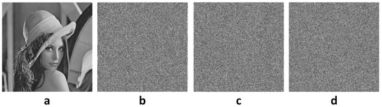 For a good algorithm, the visual effect analysis is indispensable; here we will encrypt the grayscale image of the size . Results are shown in Figure 10 and compared with the traditional RSA [6] and El-Gamal [7] encryptions. Where Figure 10a is the original Lena image, Figure 10b is the traditional RSA encrypted image, Figure 10c is the traditional El-Gamal encrypted image, and Figure 10d is the improved El-Gamal encrypted image. Figure 10 reveals that the encrypted image of the improved El-Gamal algorithm by our proposed method is the same as that of the traditional El-Gamal and RSA encryption, and all the encrypted images can achieve the visual effect of random noise images.
