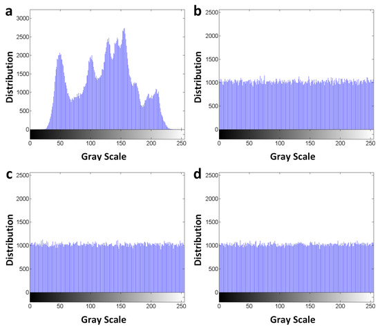 The histogram with uniform distribution is the ideal target for image encryption, so we will analyze the histogram of image encryption in this section. Figure 11 shows the histograms of the original image and images encrypted by using algorithms of traditional RSA, traditional El-Gamal, and improved El-Gamal. It can be seen that the pixel values of Figure 11b–d are distributed between 0-255, close to the ideal uniform distribution. Furthermore, we use the chi-square test [18] to analyze the uniformity of the pixel value distribution. Then, the chi-square statistics value , of the image distribution with 256 degrees of freedom is defined as follows: