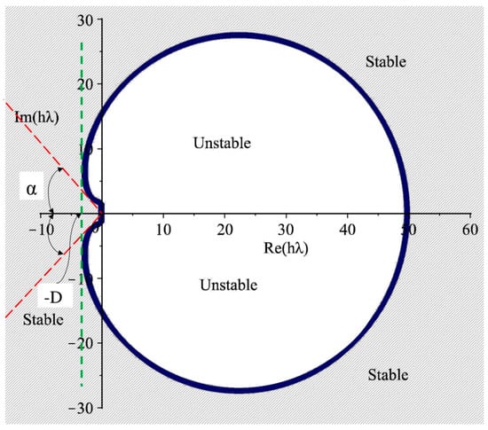 Substituting in Equation (12), we solve the following equation to determine the roots of the stability polynomial: