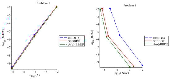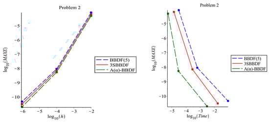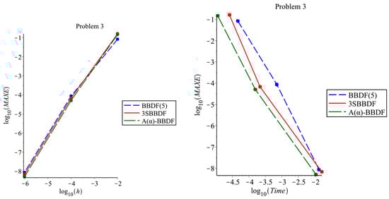 The following figures show the relation between the maximum error and computational time for Problems 1 to 3 at various step sizes.