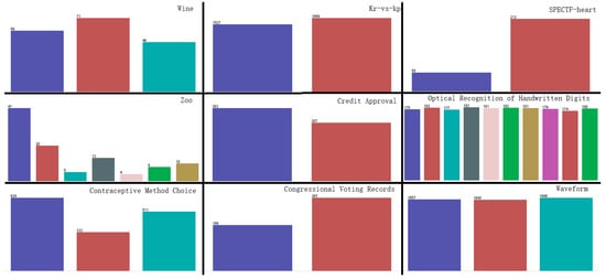 Ten datasets from the UCI Machine Learning Repository [26] are adopted in our simulation experiments. These datasets contain various numbers of features, instances, and classes, as shown in Table 3. At the same time, the distribution of each class in terms of number of instances is shown as Figure 1.