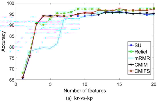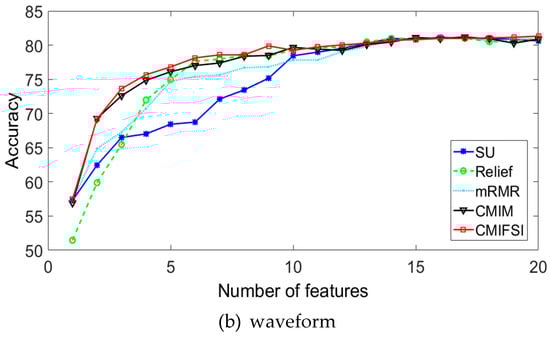 The result in Figure 2a shows that Relief seems to outperform other selectors in the majority of cases for dataset “kr-vs-kp”. The result may be confusing since Relief does not consider feature redundancy and interaction. A similar result was obtained by reference [27] on this dataset and this may be due to the properties inherent to this dataset. For other selectors which are all based on information metric, CMIFSI achieves the best performance, which is comparable to Relief to some extent. And the superiority of CMIFSI increases as more features are added for learning. For dataset “waveform” (shown in Figure 2b), CMIFSI outperforms other selectors in most cases. For instance, all plots of CMIFSI are higher than others when feature number is less than ten especially in the number of 9. As more features are added, all selectors tend to perform comparably. It is worth noting that with the increase of the number of features, it more sources may needed for calculation as part of the process of prediction.