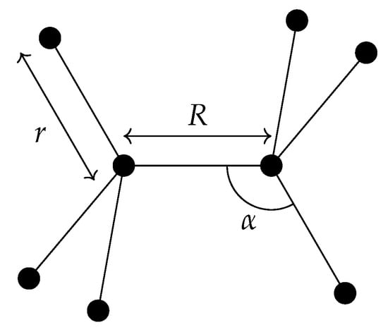 We now aim at determining a set of matrices constituting the irrep G of G. In principle, we could continue as outlined in the preceding section by utilising that G = = . However, this would imply that we use the E-representation matrices for C and C to generate G-representation matrices of G as the “super-product” matrices discussed in Section 6.4 of Ref. [1]: Each of the 16 elements of the G-representation matrix is a product of two E-representation matrix elements, one of the four elements in the C E-representation matrix times one of the four elements in the C E-representation matrix (see, in particular, Equation (6)–(97) of Ref. [1] and the discussion of it). The formation of such a super-product is not a standard linear-algebra operation and not easily programmable in maxima [38]. Consequently, we make use of a more straightforward approach: We initially note that the six CH-bond lengths , k = 1, 2, 3, …, 6, of HCCH span the representation ⊕⊕G of G. This is easily established as the transformation properties of the under the operations of G are simple permutations. We define the CH bond length as the one involving proton k, with the protons labelled as in Figure 2. We now proceed to use representation-theory methods to determine the symmetrised linear combinations of the and, subsequently, the transformation properties of the resulting G-symmetry coordinates.