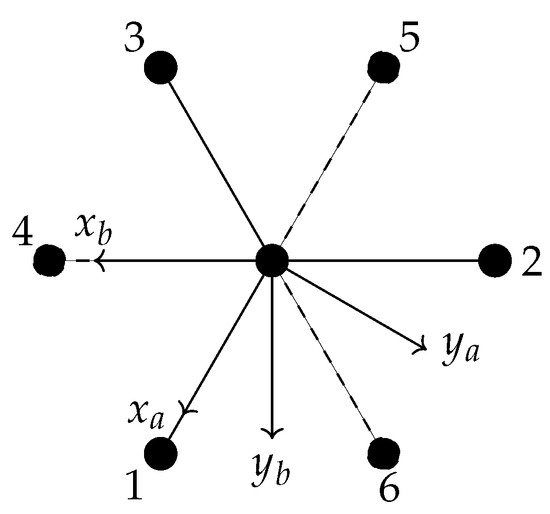 To simplify the discussion, we take the plane to be horizontal and the z axis to be vertical. We aim at obtaining the x and y components of in order to determine the “horizontal” angle it makes with , as shown in Figure A2. We require the x axis to be directed along the horizontal component (i.e., the component perpendicular to ) of . Thus, the y axis is perpendicular to the plane defined by and , so that we have and therefore , as shown in Figure A3. The unit vector defines an axis in the 1–a–b plane; this axis is analogous to the x axis in the 4–a–b plane. The dihedral angle between the two planes is the angle between the x and axes.