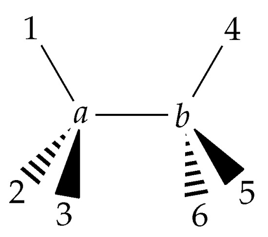 The expressions involving the dihedral angles are the most complicated. Consider the four nuclei labelled 1, a, b, and 4 in Figure A1. The dihedral angle between the plane spanned by 1, a, and b and that spanned by a, b, and 4 is shown in Figure A1 and Figure A2. We define as the unit vector obtained by normalisation of , = . The orientation of the z axis is defined by = . We need two further axes x and y (whose orientations are defined by the unit vectors and , respectively) which, together with z, form a right-handed axis system.