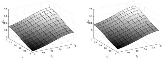 Under the assumptions that: , , , , , and , by substituting the above parameters into Equation (A12) of Proposition 5, we have: