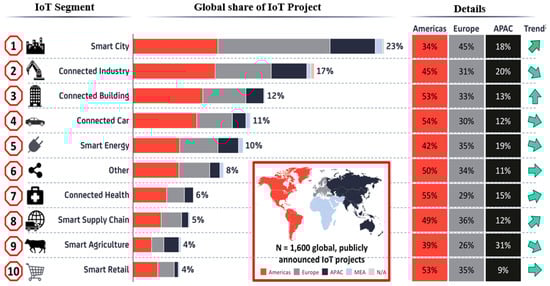 The Internet of Things (IoT) is a paradigm which aims to advance telecommunications in all spheres of human life. In the near future, symmetry technologies for the Internet of Things (IoT), along with symmetry and asymmetry applications for IoT security and privacy, will re-design the socio-ecological human terrain morphology. This advancement leads to substantial improvement in quality of human life and the world’s economic growth at large. IoT is considered the backbone of emerging applications (Figure 1) [], as innovation plays a key role in the massive evolution of machine communications. Machine-to-machine (M2M) traffic is estimated to account for approximately 45% of the total Internet traffic by 2022 []. IoT creates a platform in which physical objects can mimic certain human sensory capabilities, such as perception, vision, hearing, smell and thinking. Buoyed by these human sensory capabilities and the emerging tactile Internet, machines can communicate with one another, share relevant information and make real-time decisions with less human input, especially now that we are migrating to the 5G era, in which the expected wireless network delay is 1 ms. In this scenario, divergent sensors, such as radio-frequency identification (RFID) and sensing technology, can undertake the collaborative function of sensing, collecting and transmitting sensor information through the Internet []. Experts report that IoT holds incredible potential for smart homes, smart cities and healthcare applications []. Healthcare sectors can generate an annual revenue of $1.1–2.5 trillion by 2025 []. Moreover, the worldwide economic effect of IoT is approximated at between $2.7 and $6.2 trillion by 2025 [].