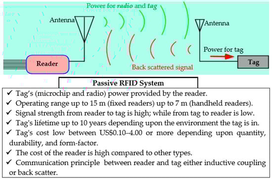 Passive RFID tags lack an inbuilt energy source; they are powered by the electromagnetic energy emitted from an RFID reader instead. Passive RFID tags are popular in several applications, such as access control, file tracking, race timing, supply chain management and smart labels. The cheap price of RFID tags allows their wide deployment across a wide spectrum of the industry. RFIDs have already been promoted as the most cost-effective solution with satisfactory achievements in smart parking systems []. RFID in smart parking systems have mainly been used for check-ins and check-outs of passing vehicles in parking areas; such vehicles are equipped with e-pass cards with active RFID tags []. Each vehicle that enters a parking area has a unique identification number that can be paired with its license plate. The barriers only open if the vehicle is recognised as being registered. Moreover, the authors in [] combined RFID technology with wireless sensors to collect information on the occupancy state of parking spaces and direct drivers to the nearest vacant parking lot. Other for vehicle validation at the entrance and exit of a parking area, RFID technology has been utilised for parked vehicle localisation by exploiting the time difference of arrival and the received signal strength measurements []. Furthermore, the authors in [] presented an analysis and evaluation of a passive RFID-based framework in the context of smart parking systems. The main novelty of the proposed framework is the adoption of RFID tag-to-tag communication, which can support a more energy-efficient collection of information than the conventional direct type of communication. The overall framework is considered and examined within a smart parking system use case scenario, in which RFID technology is adopted for: (a) vehicle validation when entering and exiting the parking area; (b) identification and localisation of parked vehicles; and (c) smart parking space management. The superiority of the proposed framework over conventional direct RFID reader tag communication is demonstrated in terms of: (i) the reduction of RFID readers’ transmission power to the required minimum to guarantee connectivity, and (ii) the expansion of RFID readers’ coverage areas to communicate with many distant tags. A summary of the passive RFID system is given in Figure 3.