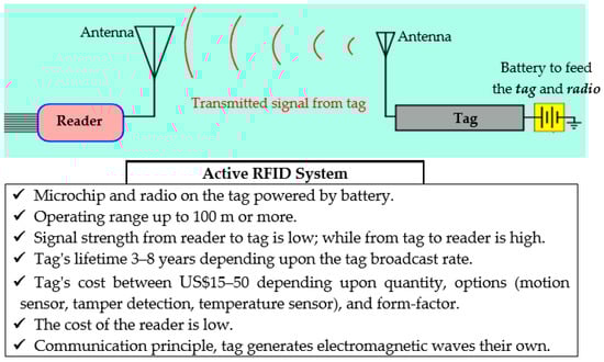 A battery-assisted RFID tag that uninterruptedly broadcasts its signal is known as Active RFID. Active RFID tags are usually deployed as “beacons”, which precisely trail the real-time position of targets or in high-speed settings such as tolling. Active tags which are battery powered have a greater reading range when compared to passive tags; however, they are also much costlier. A summary of the active RFID system is given in Figure 4.