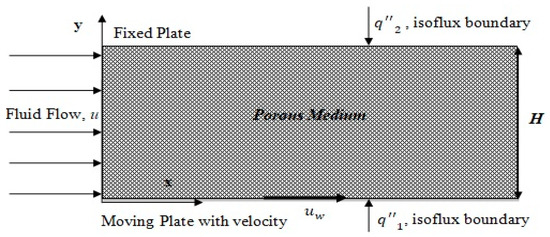 Figure 1 is a schematic diagram of the problem where there is a steady, laminar, hydrodynamically, and thermally fully-developed flow through porous medium between two plates separated by a gap of height . The lower plate moves at a constant velocity while the upper plate is stationary. Uniform heat flux is applied to both plates whereby and are applied to the moving plate and stationary plate, respectively. In solving the governing thermal energy equation, temperature field is first derived subjected to a uniform heat flux at a moving wall. By defining a heat flux ratio and rewriting as , the temperature field for the prior solved single heated wall only solution can then be transformed to temperature field having both boundaries subjected to uniform heat flux. The details is provided in Section 2.1.