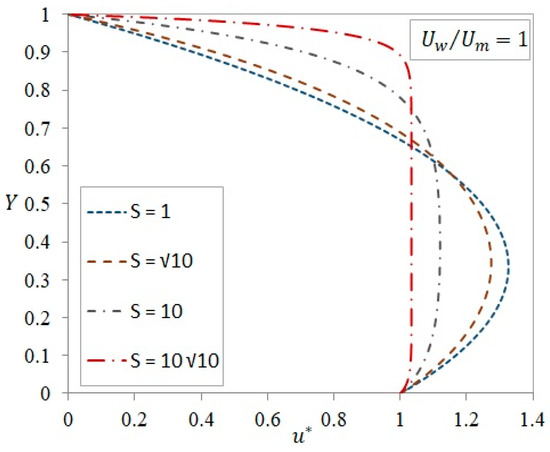 In order to facilitate the discussion of Couette-Poiseuille flow in a saturated porous medium, the velocity field in the channel for different porous medium shape factors is depicted in Figure 2 for , that results in profile with a maximum velocity. Velocity gradient in the vicinity of a moving wall is higher for low porous medium while larger porous medium gives rise to steeper gradient in the vicinity of the fixed wall. Flow velocity is also higher for lower porous medium in the vicinity of the moving wall.
