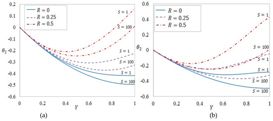 Dimensionless temperature distribution subject to constant heat flux at both boundaries for different heat flux ratio, R. (a) and (b) .