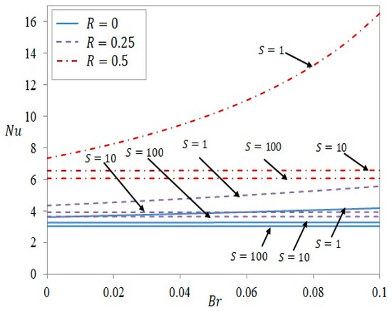 Figure 5 illustrates the variation of Nusselt number defined at the moving wall versus Brinkman number with shape factor being the parameter, indicating its heavy reliance on There is an expected increase in for , particularly with a large , attributed by a reduced heat flux at the moving wall, and therefore, a decrease in the temperature difference between moving wall temperature and bulk mean temperature when both plates are heated, as reflected in Figure 4b. While higher indicates more intense viscous dissipation, competing effect between the more dominant convection and heat generation leads to a higher Such effect is caused by enhanced heat convection effect at a specified , which is more significant for low . As approaches infinitely large value, has no noticeable effect on , indicating the heat generation effect being offset by convection due to the velocity and viscous dissipation distribution depicted in Figure 2 and Figure 3 at a fixed , a higher is accompanied by heat convection enhancement at the moving wall.