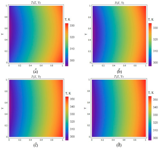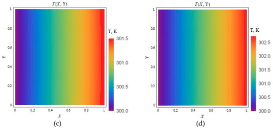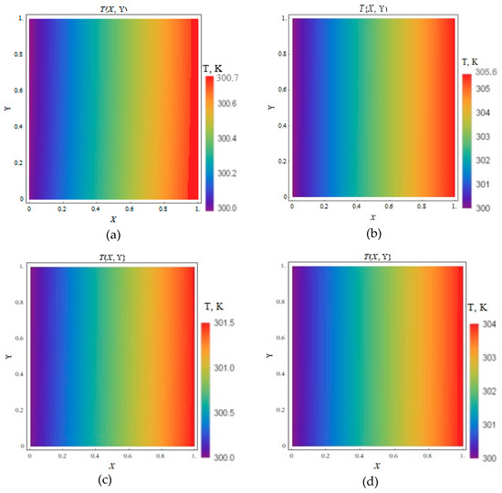 Temperature field in a microchannel, for and W/m·K based on the thermal physical properties of Table 3. (a) Re = 100 without viscous dissipation, (b) Re = 100 with viscous dissipation, (c) Re = 50 without viscous dissipation, (d) Re = 50 with viscous dissipation.