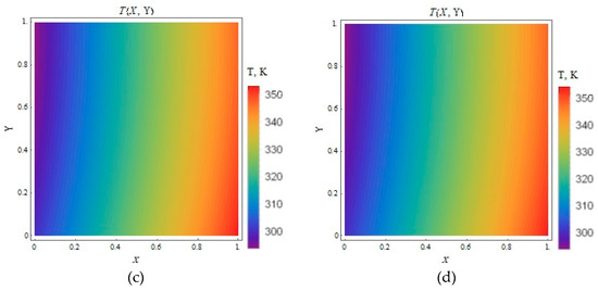 Figure 8 and Figure 9 represent two-dimensional temperature field for heat flux applied at both boundaries for microchannel and conventional channel ducts, respectively. The same thermophysical properties of fluid and porous material are applied, as given in Table 3 and Table 4, respectively. Figure 8a,c depict the same range of temperature achieved in the channel as in Figure 6a,c but shows much higher temperature in transverse direction due to an increase in heat transfer coefficient, similar to Figure 9a,c as increases from . Likewise, Figure 8b,d reflect significant viscous dissipation effect on the axial temperature variation whereas for conventional channel in Figure 9b,d, the change in transverse temperature is more noticeable than the microchannel. In a microchannel, the surface temperature approaches the mean temperature due to its apparently much higher heat transfer coefficient than a conventional channel. Expectedly, a more gradual temperature change is noted in the proximity of the moving wall due to its higher heat transfer coefficient than the fixed wall. A decreasing temperature field with increasing Reynolds number indicates the enhancement in convection.