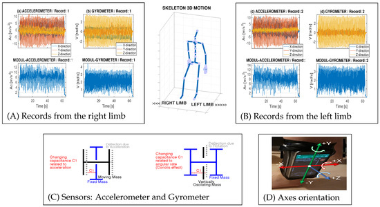 The signals recorded by microelectromechanical sensors (MEMS) and handheld devices [4,5,6] including accelerometers and gyrometers [7,8] form one of information sources for the detection of motion features that can be combined with further signals and images recorded by different specific sensors, video systems, and depth cameras [9]. The selection and time synchronization of sensors suitable for specific goals is the basic initial problem in this area dependent on the desired application.
