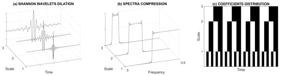 Shannon wavelet functions presenting (a) their dilation in the time domain, (b) corresponding spectra compression, and (c) distribution of scalogram coefficients.