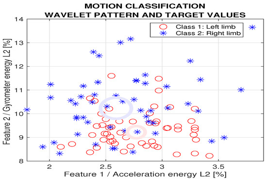as presented in Figure 3 for the left and the right legs using the energy in the second decomposition level. The moduli of the variables acquired by the accelerometer and gyrometer were used to avoid problems with the changing directions of the coordinate system during the motion. An associated matrix of target values with rows defined class 1 (the left limb) or class 2 (the right limb) in the learning stage.