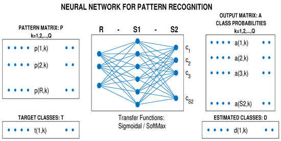 The network coefficients included the elements of the matrices , and the associated vectors , . The proposed neural network with the selected number of units in the first layer used the sigmoidal transfer function in the first layer and the probabilistic softmax transfer function in the second layer. The values of the output layer, based on the Bayes theorem [28], using the function