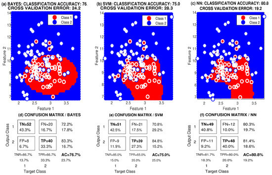 Classification of wavelet features performed by the neural network 2-10-2 (for the training (70%), validation (15%), and test (15%) sets) was compared with results from the k-nearest neighbour, the Bayesian approach, and a support vector machine methods based upon different principles [56]. Figure 5 presents the classification results for experiment , which lasted 180 s, and the Haar wavelet function as specified in Table 2. The characteristics used include the relative energy at the second wavelet decomposition level for the signal recorded by an accelerometer (feature 1) and a gyrometer (feature 2). The features include those for the left leg signals (class 1) and the right leg signals (class 2). This figure compares the class boundaries evaluated by the Bayesian method, a support vector machine, and a two-layer neural network model. Figure 5d–f present associated confusion matrices.