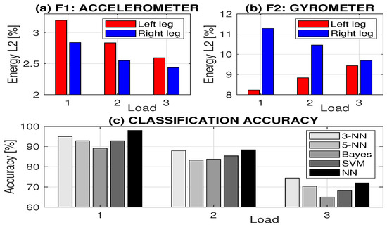 The comparison of (a) the mean energy at the second Haar decomposition level for signals recorded by the accelerometer (feature ) and (b) gyrometer (feature ), and (c) classification accuracy for different methods for the left leg (class 1) and the right leg (class 2) with respect to the load during the exercise.
