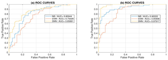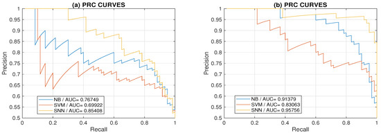 Figure 7 presents a comparison of receiver operating characteristic (ROC) curves for classification by Bayesian, support vector machine, and neural networks methods for the medium load using two and six features. Results show that the area under individual curves was the highest for neural network models. Classification using six features presented in Figure 7b show how the higher number of features increases the true positive rate. Figure 8 presents corresponding precision-recall (PRC) plots. As we used balanced datasets, the use of ROC curves provided sufficient information. In the case of unbalanced datasets, the use of PRC plots is recommended [57].