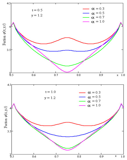 Profiles of function for different values of the fractional parameter α, y = 1.2, t = 0.5 and t = 1.0.