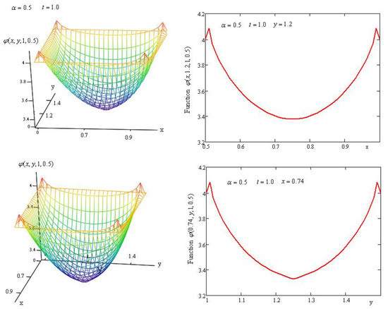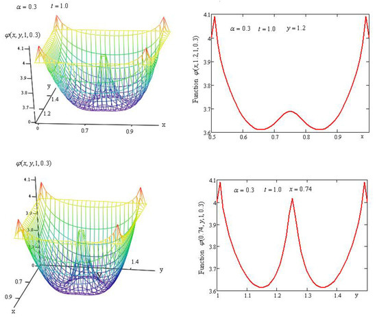 In Figure 2 and Figure 3, we show the plotted surfaces for the fractional parameters and , respectively, along with the sections through planes .