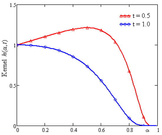 For small values of the fractional parameter, the concentration has maximum values in the central area of the rectangular . If the fractional parameter increases, the concentration has a minimum in the same area. This behavior is due to the kernel of the time-fractional Caputo–Fabrizio derivative (see Figure 4) which, for , increases for and decreases for . Therefore, at small values of the fractional parameter, the weight function in the fractional derivative has bigger values and the influence on the concentration is stronger.