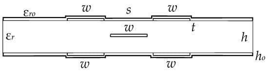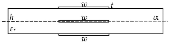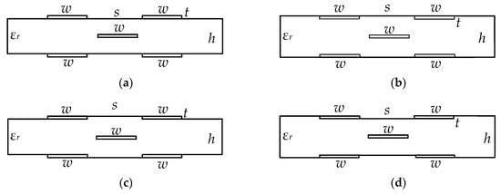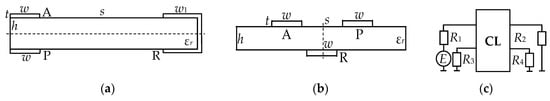 In addition, in order to obtain equal amplitudes of the decomposition pulses at the MF output, the matching symmetry is important, which is discussed below. We considered the lines with strong and weak couplings. Their cross-sections are presented in Figure 3a,b respectively, where w is the width of the conductors, s is the separation between them, t is the thickness of the conductors, h is the thickness of the dielectric and εr is the relative permittivity of the substrate []. It is established that for the amplitudes of the decomposition pulses to be equal, it is essential to provide the axial symmetry of the structure cross-section (active and passive conductors are mirrored with respect to the reference, located on symmetry axis) and the symmetry of loads R (Figure 3c) expressed by