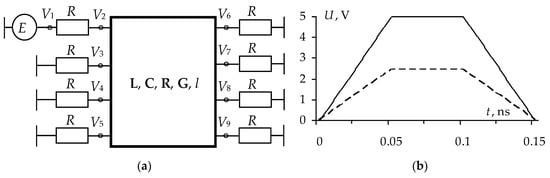 The schematic diagram of the reflection symmetric MF is shown in Figure 7a. The resistance values (R) were taken to be equal to 50 Ω while the MF length was l = 1 m. To simulate the time response, we used a source of trapezoidal pulse signals, represented by an ideal EMF source with an amplitude of 5 V and with durations of rise, fall and flat top of 0.05 ns each, so the total duration of the input pulse (tΣ) was 0.15 ns (Figure 2b). The simulation of the frequency response of the MFs was performed with the harmonic excitation of the EMF source of 2 V in the frequency range from 1 MHz to 3.5 GHz.