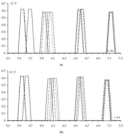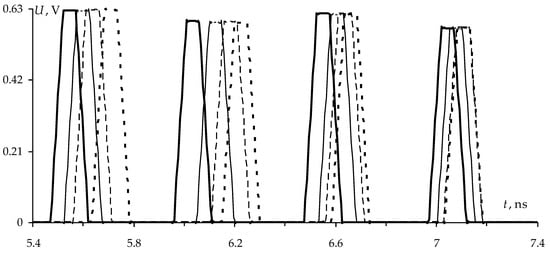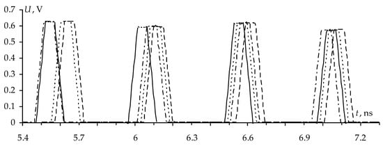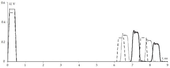 The simulation results (values of the maximum voltage at the end of the active conductor Umax and differences of decomposition pulse delays Δti) of the reflection symmetric MF covered with one, two and three lacquer layers, as well as without coating, are summarized in Table 14. The waveforms at the MF output are shown in Figure 18.