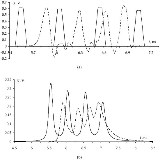 Optimization by two criteria performed separately allowed us to obtain positive results, but when one criterion is reached, the other deteriorates. Thus, when criterion 1 is fulfilled (Figure 9a), the first and second pulses become closer to each other, which can lead to their overlapping (for example, due to dispersion, when considering the losses or increasing the duration of the input pulse), however, the equal amplitudes of pulses 1 and 3, as well as 2 and 4 are obtained. When criterion 2 is fulfilled (Figure 9b), an increase in the maximum voltage at the end of the active conductor from 0.627 V to 0.63 V is observed, which somewhat reduces the attenuation coefficient of the MF, however, equalized values of the delay differences of decomposition pulses are achieved. Meanwhile, with such optimization, attention was not paid to the matching of the path, although it is important for minimizing reflections of useful high-frequency signals from the MF input. Thus, it is advisable to perform multicriteria optimization to further improve the characteristics of the reflection symmetric MF simultaneously using three criteria: minimizing the maximum voltage (max(U)) at the MF output, equalizing the time intervals between decomposition pulses (Δti), and ensuring matching with the path of 50 Ω. To achieve matching, we used the condition that the signal amplitude at the beginning of the line (V2) should be equal to half the EMF of the signal source (V1) (Figure 7a) []. The optimization by three criteria was performed for four reflection symmetric MF structures (Figure 6) by heuristic search in the range of parameters.