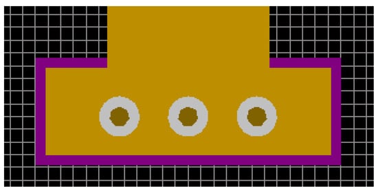 A connection pad (CP) of 0.85 × 2.8 mm was used to mount the matching resistors and Subminiature version A (SMA) connectors. In the CP, to ensure connection with the reference conductor, there are three vias with a diameter of 0.2 mm (Figure 13). The vias are taken out to the upper and lower layers of the PCB on the CP.