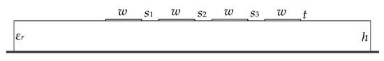 Reflection symmetry of an MF is proposed to improve the interference protection devices based on modal filtration technology. However, as noted earlier, there are other MF structures. Therefore, it would be useful to make a qualitative comparison of the reflection symmetric MF with another MF that is close in structure. For the comparative analysis, the four-conductor microstrip (Figure 19) and reflection symmetric MF structures were selected. These MFs have the same number of conductors but differ in their emplacement. Such a comparison will make it possible to determine the advantages and disadvantages of each device, and, in particular, to identify the pros and cons of using reflection symmetry.