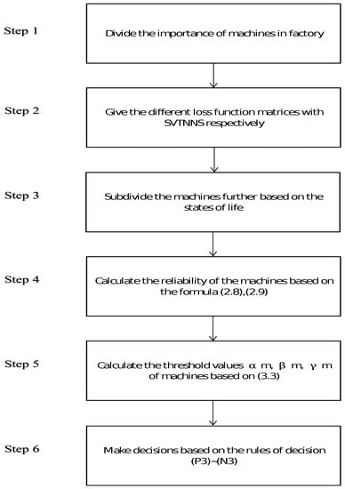 Based on the above analysis, the highlights of this paper mainly include the following points: (1) We fuse the theory of reliability into the three-way decisions method, replace the conditional probability in the three-way decisions method with reliability, and then apply the novel three-way decisions method to the overhaul of machines in factories. (2) We describe the loss function with single-valued triangular neutrosophic numbers (SVTNNs) and propose an operator to calculate the score function of triangular neutrosophic numbers. (3) These machines are classified into different equivalence classes according to their importance and their stages of life. (4) When the machines of different importance fail, they will cause different losses. Therefore, we propose different loss function matrices for them. Such a design is in line with the practical application of engineering.