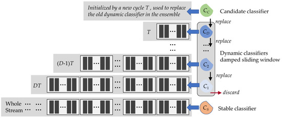 At the early stages of the learning procedure, a stable classifier Cs and a candidate classifier Cc are created. The stable classifier exists during the whole learning procedure. The candidate classifier learns only instances of a time cycle. Whenever a new time cycle occurs (line 5), the candidate classifier trained by the last time cycle is copied as a new dynamic classifier and included in the dynamic classifier damped sliding window. Then, the candidate classifier is reset. If the number of dynamic classifiers is greater than D (lines 7–9), the subsequent classifier replaces the former classifiers one by one, Cd ← Cd+1 (d = 1, …, D−1), to keep the number of dynamic classifiers at D. The candidate classifier is used as the new dynamic classifier CD. Then, the algorithm updates the weight of the classifiers according to Equation (3) and calculates the damped class imbalance ratio using Equation (4). In the dynamic classifier damped sliding window, older dynamic classifiers are trained by more former arriving instances and have less predictive weight, which helps the ensemble classifier always attach importance to the latest data stream concept. The stable classifier exists for the whole learning process and can address gradual concept drift and cyclic concept drift better.