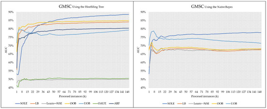 In this section, to intuitively show the classification performance of different algorithms, the PAUC–time curves are plotted. Figure 2 shows the PAUC–time curves for GMSC using different base classifiers. SOLE achieves the highest PAUC using both the Hoeffding tree and the naive Bayes as the base classifier. For the PAUC–time curves using the Hoeffding tree as the base classifier, SOLE achieves a low value at the beginning of the learning process. The PAUC value of SOLE continues growing and obtains first place at the end of the process. For the PAUC–time curves using the naive Bayes as the base classifier, the UOB achieves first place at the beginning. However, the PAUC of UOB continues to decrease, and the PAUC of SOLE continues to increase. Thus, SOLE performs better than UOB after approximately the 15 k time step.