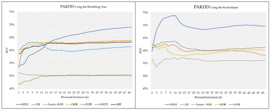 Figure 3 shows the PAUC–time curves for PAKDD using different base classifiers. SOLE achieves the highest PAUC for both using the Hoeffding tree and the naive Bayes as the base classifier. For the PAUC–time curves using the Hoeffding tree as the base classifier, SOLE achieves fourth place at the beginning. Additionally, the SOLE PAUC value continues to increase, but the PAUC of the other algorithms is stable. Therefore, SOLE achieves the highest PAUC at the end. Then, for the PAUC–time curves using the naive Bayes as the base classifier, SOLE is better than the other algorithms throughout the whole learning procedure.
