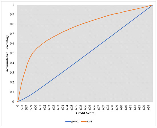 As shown in Table 8, risk clients are mainly distributed in the score intervals under the credit score of 604.6. As the credit score increases, the bad debt ratio decreases rapidly. Therefore, SOLE effectively reflects the real credit condition of the clients. The credit score can be used as the basis to assess the credit condition of the clients. In the actual financial risk control business, the KS test is usually used to evaluate the performance of a model. The KS test uses the difference between the accumulative percentage of good clients and the accumulative percentage of risk clients to show the distinguishing ability of a model. The larger the value of the KS test, the better the distinguishing ability. Table 9 shows the relationship between the KS test and distinguishing ability [31].