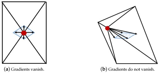 Figure 1a shows an example when the gradient of the constituent element quality with respect to the free vertex (red) vanishes. The four arrows indicate the (negative) gradient of their quality with respect to the free vertex. Since our goal is to minimize the objective function as in Equation (2), we consider the direction of the negative gradients. The blue area indicates a convex hull of the gradients, and the free vertex is located inside the convex hull of the gradients. For this case, the gradients vanish since all elements around the free vertex reach the ideal element qualities. Therefore, the movement of the free vertex could deteriorate the element qualities (of at least one element) around the free vertex. Figure 1b shows an example when the free vertex is located outside the convex hull of the (negative) gradients of the constituent element quality functions. For this case, the movement of the free vertex is able to significantly improve all element qualities around the free vertex. Therefore, we prioritize this free vertex when the vertex reordering is performed.