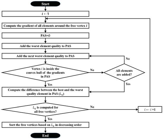 To compute the ordering of free vertices, we first sort our elements based on their quality by descending order and compute the gradient of their quality with respect to the free vertex. Second, for every free vertex, we start with the worst-quality element and add other elements to this “pseudo-active” set (PAS) until the gradients of the function defining their qualities are suitably directed such that their convex combination of gradients can vanish. Specifically, we add the next worst-quality element to PAS until the free vertex is inside the convex hull of the gradients. Third, we compute the difference in the quality of the best () and the worst-quality () element in the PAS for every free vertex. Finally, we sort the vertices based on the difference in the quality () in descending order, where  is computed as -. The flowchart and the pseudo code of our algorithm are presented in Figure 2 and Algorithm 1, respectively.