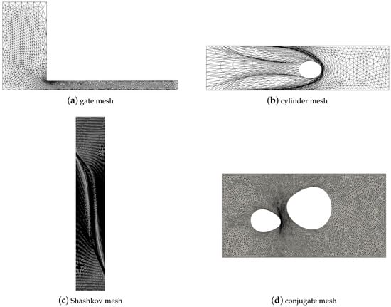 (a) Gate mesh, (b) cylinder mesh, (c) Shashkov mesh, (d) conjugate mesh.