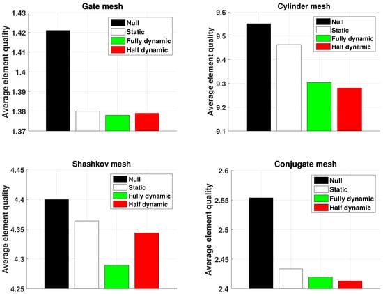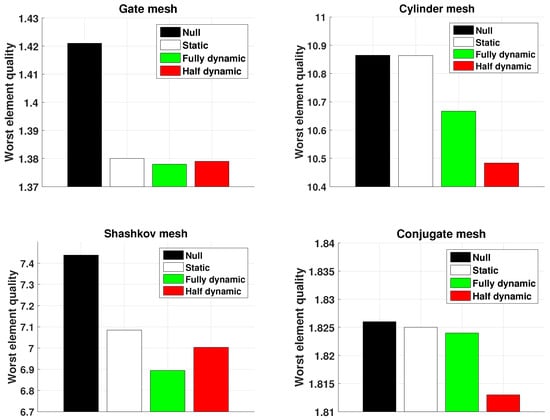 Sastry et al. developed a global formulation for the objective function based on the log-barrier technique, which improved the quality of all poor elements in a mesh, not just the worst one []. A global formulation is sometimes too expensive since all we really need is a way to improve the quality of few poor elements in a mesh. Thus, local techniques may be preferred for this purpose because it takes much less time.
