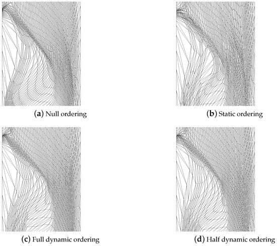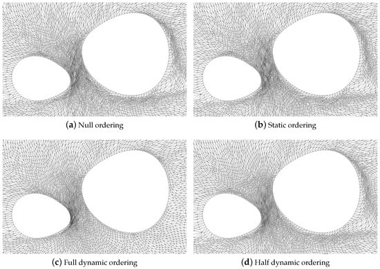 Park et al. [] investigated static vertex reordering techniques to improve the efficiency of the mesh optimization algorithm. They investigated the effect of static vertex ordering on the time taken for the Laplacian smoothing algorithm to converge. In total, they investigated twenty vertex ordering techniques and explored the sensitivity of the timing results with the termination criterion and the mesh size. As in the previous study [], the results of the paper were not definitive.
