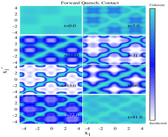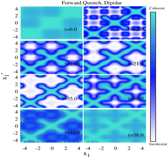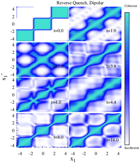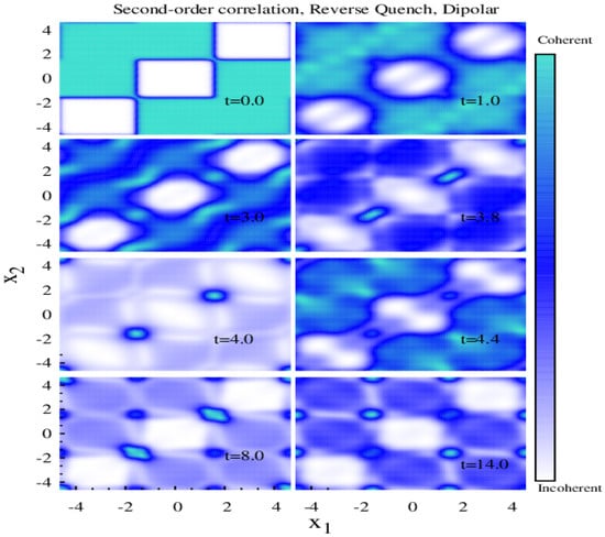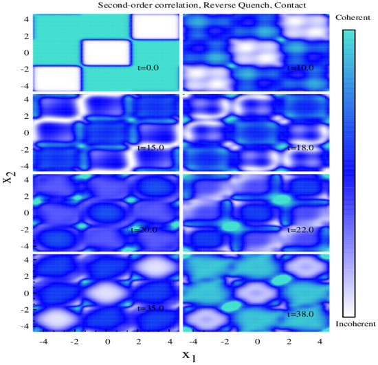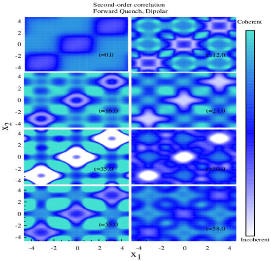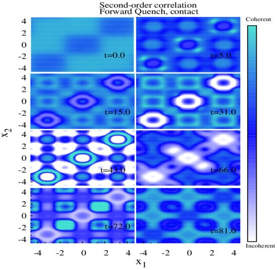 It is also interesting to compare the reverse quench dynamics for the contact interaction. The corresponding normalized first-order Glauber’s correlation function, entropy dynamics and normalized second-order Glauber’s correlation function are presented in Figure 8b, Figure 10 and Figure 11, respectively. All of them exhibit collapse–revival dynamics. In Figure 10, we observe that initial Mott phase with exclusive diagonal correlation gradually builds up off-diagonal correlation—it is a phase. At some later time, phase comes back. In Figure 8b, we also observe that, in the revival–collapse cycle—entropy passes through maximum–minimum points. The normalized second-order Glauber’s correlation function shown in Figure 11 also exhibits the revival–collapse scenario. Initially, the system has strong anti-bunching effect across the diagonal, which gradually disappears with time and the system becomes fully second-order coherent. At a later time, the anti-bunching effect develops again.