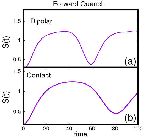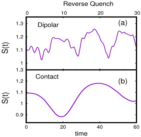 Time evolution of Shannon information entropy for forward lattice-depth quench to : (a) dipolar interaction; and (b) contact interaction. In both cases, entropy passes through maximum point ( phase) and minimum point ( phase) in their corresponding time scale. All quantities are dimensionless.
