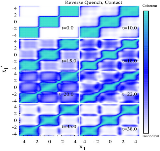We prepared the system in the initial state with the lattice depth and interaction strength which is a phase exhibiting both inter- and intra-well coherence and tunneling is allowed. In the forward quench, we instantaneously increased the lattice depth to keeping fixed. The corresponding time evolution of the normalized first-order Glauber’s correlation function is plotted in Figure 1 as a function of two spatial variables and for various time t. Initially, at time , the correlation function remains close to unity for all (, ), the system is therefore fully coherent. With increase in time, as fragmentation is built up in the many-body state, the off-diagonal () correlation is gradually lost. At time , when the many-body state is completely fragmented, the correlation function is unity almost exclusively along the diagonal ( = ). Away from the diagonal (), the correlation function is close to zero. The complete loss of off-diagonal correlation characterizes the fragmented state. However, in long-time dynamics, we observe that the system starts to build up coherence. At time , both inter- and intra-well coherence is regained ND becomes unity for all (, )—the system revives to phase.